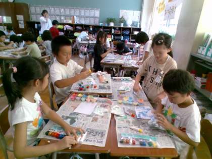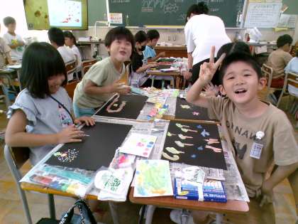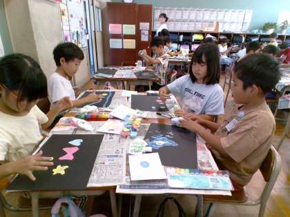 2年生「図画工作 とろとろえのぐで かく」 公開日 2024/09/04 更新日 2024/09/04 2年生の活動 「気持ちわるい!」 指でとろとろ絵の具を触った子供たち。 思い思いの色を作り、指を筆代わりにして、 「くるくる」「トントン」「シュッシュッ」「ペッタン」と思い思いに楽しみました。 どれも個性豊かな作品に仕上がりました!