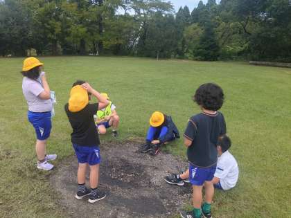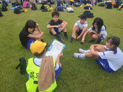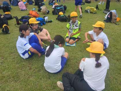 オリエンテーリングが無事終わり、班ごとに振り返りの活動中です。
