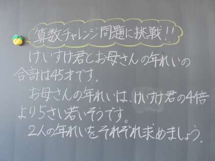 【6年生】 算数チャレンジ問題に挑戦! 公開日 2020/05/08 更新日 2020/05/08 6年生の活動 今日の学習は順調に進んでいますか。課題が終わった人は写真の問題に挑戦して答えを自主学習ノートに書いてみましょう。 答えは12日(火)にホームページにのせるので、ぜひチェックしてくださいね。