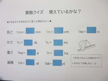 【5年生】算数 覚えているかな? 公開日 2020/05/19 更新日 2020/05/19 5年生の活動 算数クイズです。1年生から4年生までに勉強した単位について復習しましょう。覚えているかな?わすれてしまった問題は、もう一度確かめておきましょう!5年生でも新しい単位を勉強するよ!お楽しみに!