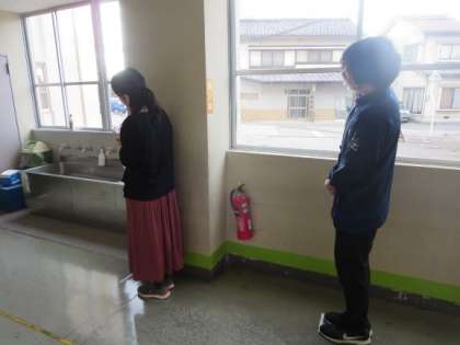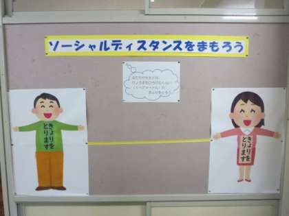 学校では、友だちや先生ときょりをとってすごします。手をあらいたいときは、手あらいばのほうをむいて、せんのばしょにしずかに立ちます。トイレにならぶときも同じです。みんなで気をつけて、じぶんの体をまもっていきましょうね。