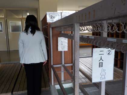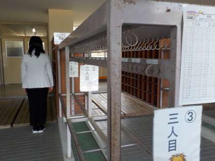 児童玄関では、ソーシャルディスタンスで、間をあけて順番に並びましょう。