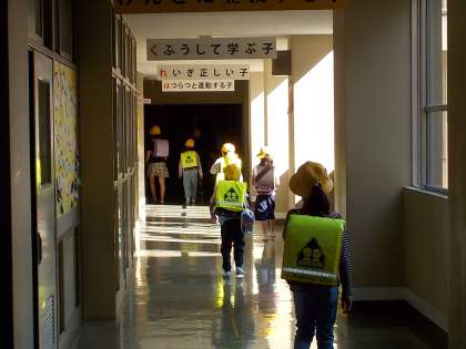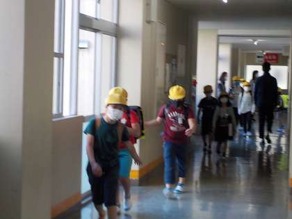 ソーシャルディスタンス(=思いやりの距離)を意識して児童玄関に入ってくる呉羽っ子たち。校舎内も右側を1列歩行して、教室に向かいます。
