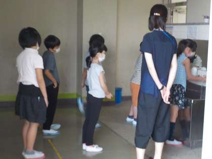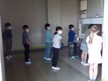 ソーシャルディスタンス=思いやりの距離を保って、並んでいます。