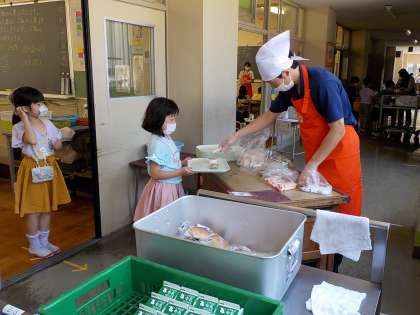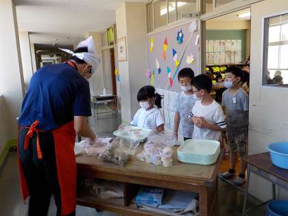 教室の中を一方通行で進み、順序よく配膳していく2年生です。