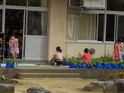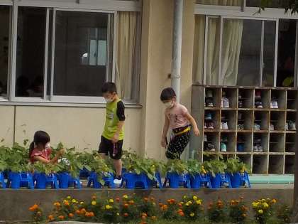 登校すると、すぐに朝顔に水やりをする1年生です。ぐんぐん生長する朝顔です。