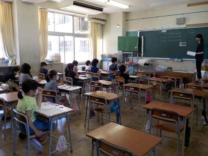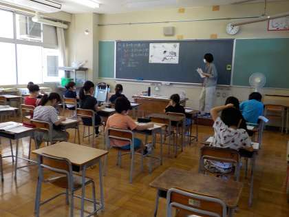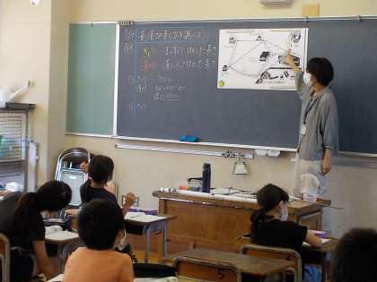 二つの教室に分かれ、少人数で学習しています。今日は、距離と道のりの違いを学んでいます。