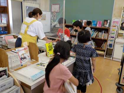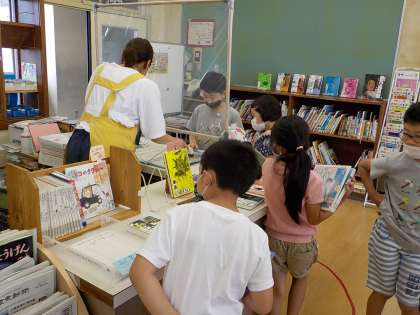 ソーシャルディスタンスをとって、本の返却や貸し出しを行っています。