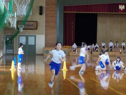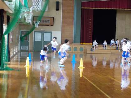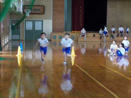 体育館で、バトンなしのリレーをしました。全力疾走しています。