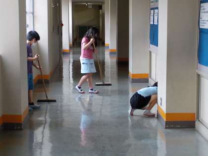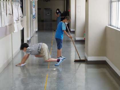 7/13 通常清掃が始まりました! 公開日 2020/07/15 更新日 2020/07/15 アクションプラン 今週の月曜日、7月13日から子供たちによる通常清掃が始まりました。掃除用具を使って一生懸命清掃しています。 トイレ掃除は、当面教職員で行います。