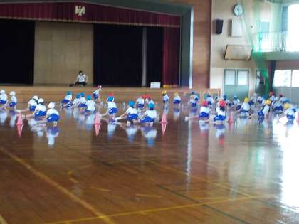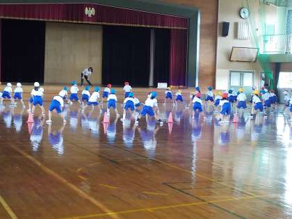 体育館で体育の学習を行いました。号令をかけながら、元気に準備体操をしています。