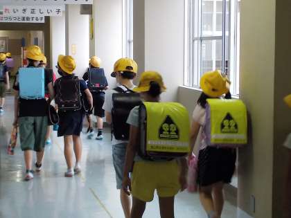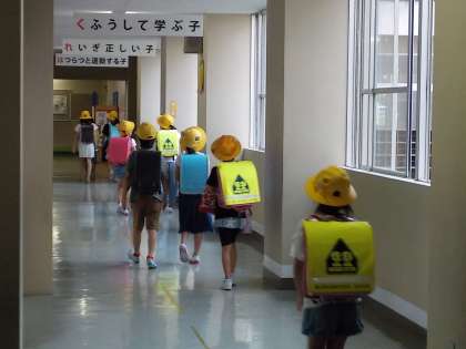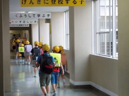 朝の登校時間中に突然の雨。その中でも、元気に登校してきた呉羽っ子たちです。