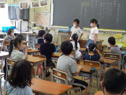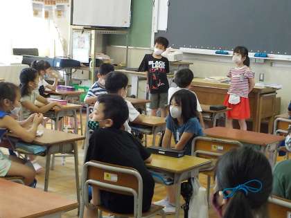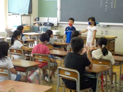 日直さんが朝の会の中で、1分間スピーチをしています。