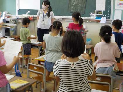 8月は、朝の会で、今月の歌「あしたははれる」を歌っています。
