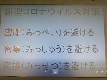 校内放送での終業式後、各学級でお話を聞きました。「ひみつの こうじすいかまん ねっ」という合い言葉に合わせて、分かりやすくお話しされました。