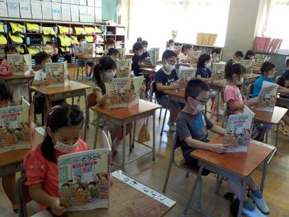 背筋を伸ばし、両手でしっかり教科書をもって音読しています。