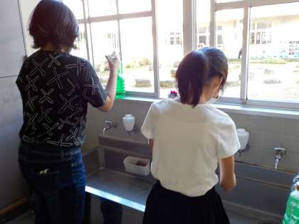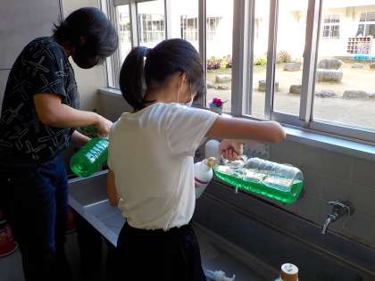 毎日、シャボネット液を使ってしっかり手洗いしている呉羽っ子。健康委員がシャボネット液の補充をしています。