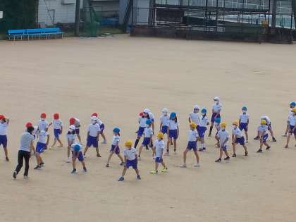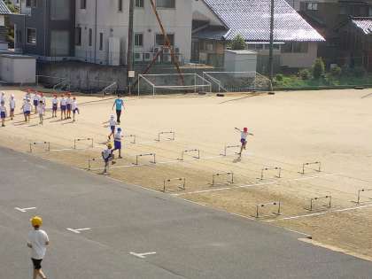 呉羽っ子スポーツフェスティバルに向けて、50mハードル走に取り組んでいます。準備運動を丁寧に行っています。