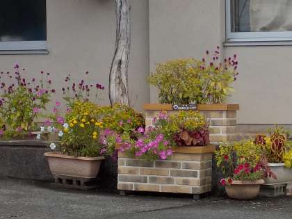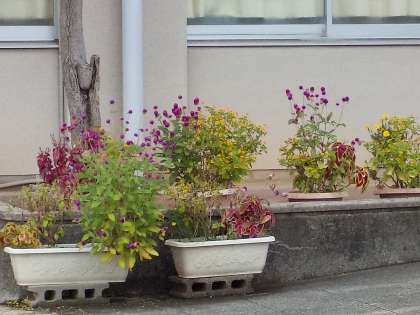猛暑が続いていますが、正面玄関前のプランターの花々は生き生きと咲き誇っています。