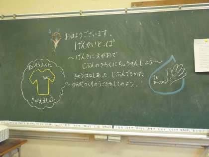 登校すると、黒板には担任の先生からメッセージが書かれています。1日の見通しがもてますね。