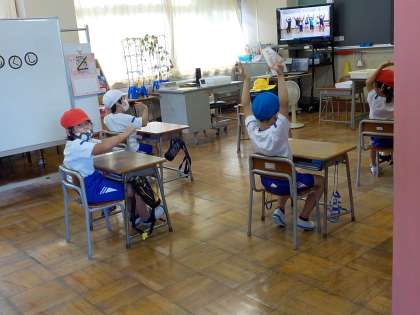 朝の会で「からだリメイク体操」に取り組んでいます。授業中もよい姿勢を心がけています。