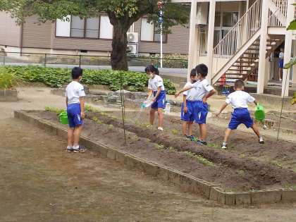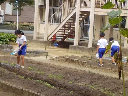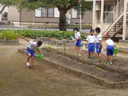 2年生は登校すると、畑に水やりに行きます。今年は秋植えの野菜作りに挑戦します。