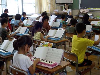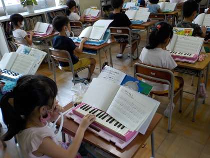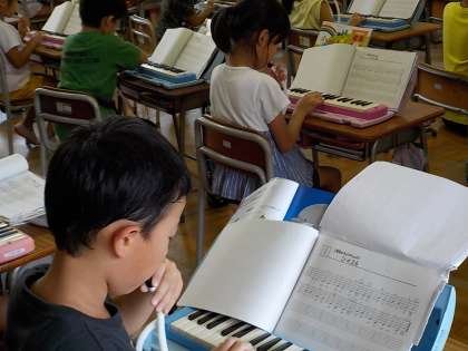 リズムに乗って、楽しく鍵盤ハーモニカを演奏しています。
