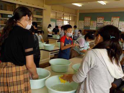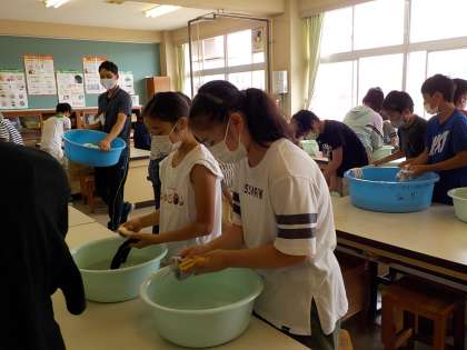 洗濯の学習をしています。軍手の汚れを手洗いで落としています。