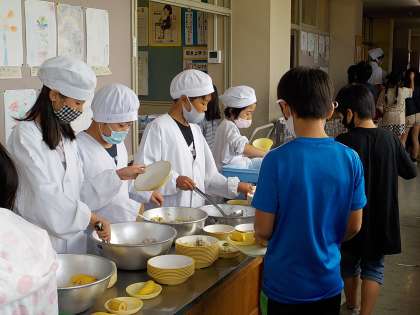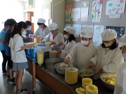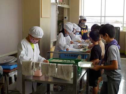 ソーシャルディスタンスを保って、整然と配膳しています。