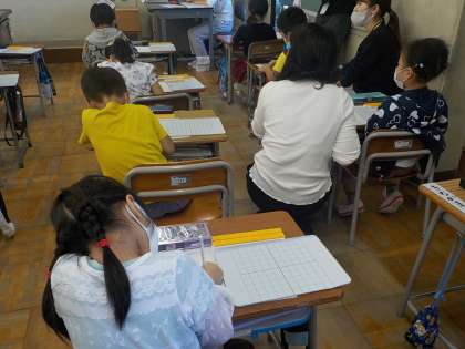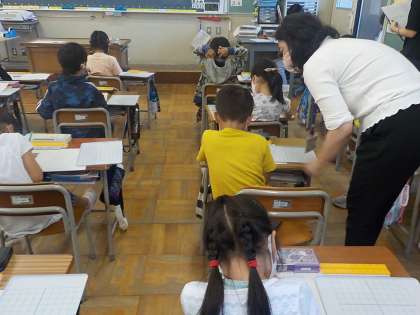 「3つのかずのけいさん」について学習しました。自分の考えをワークシートに書いています。