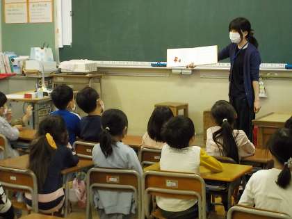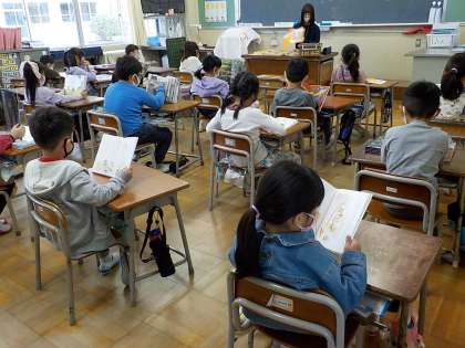 本の世界に浸っています。 担任による読み聞かせを楽しむ学級もあります。
