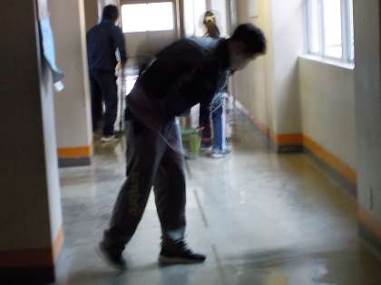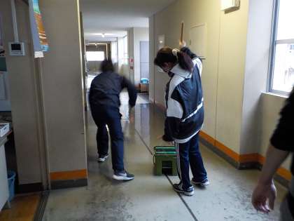 呉羽っ子が下校した後、教職員で廊下や階段のワックスがけをしました。