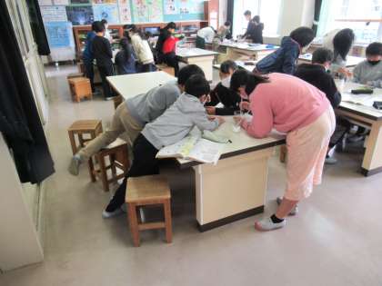 物が水に溶ける量を調べるための実験を行っています。食塩とミョウバンは、それぞれスプーンで何杯入れると、水に溶けなくなるのでしょうか?子供たちは、実験へ熱心に取り組んでいます!