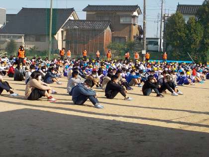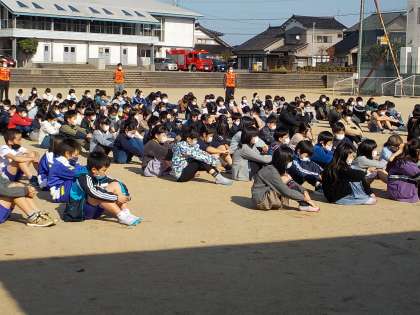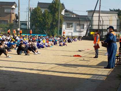休憩時間中に給食室より出火したという想定で、避難訓練を実施しました。呉羽消防署の3名の消防士の方が、避難訓練の様子を見てくださいました。