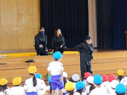 忍者が3名、1年生のみんなに、新しい学習の進め方の修業を始めた場面です。