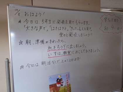 4年生 はきはき、堂々 公開日 2024/10/08 更新日 2024/10/08 4年生の活動 4年生の学年掲示板の一言メッセージです。 校内発表後にはこのめあてに関して、たくさんの褒め言葉と、あと一歩のためのアドバイスが投げかけられたようです。