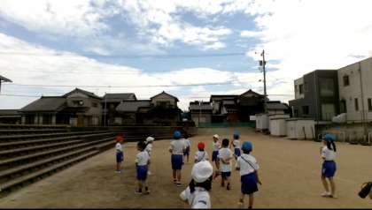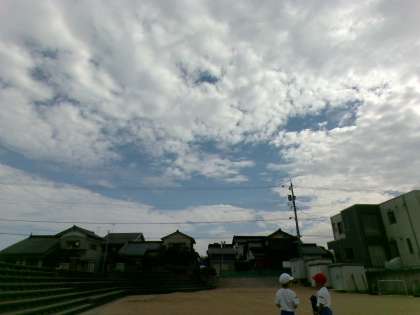 1年生は、国語で「くじらぐも」を学習しています。今日は実際にくじらぐもを探しにグラウンドへ行きました。くじらのような形の雲を見付けた子供は、教材文と同じように「おーい」と呼びかけていました。