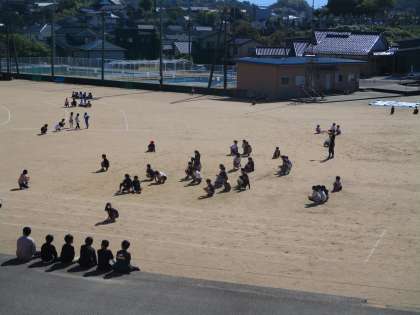 上から2枚の画像は、休み時間においても緊急放送がなったとき、腰を下ろして情報を聴き取っている様子です。