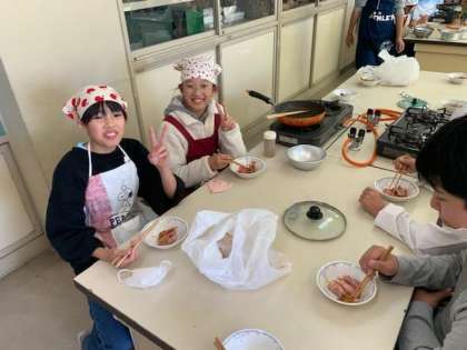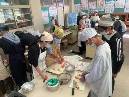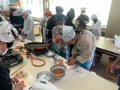 家庭科の時間に、調理実習を行いました。今回のメニューは「野菜のベーコン巻き」です。野菜をしっかりと茹でたり、炒めたりしながら、おいしく作ることができました。