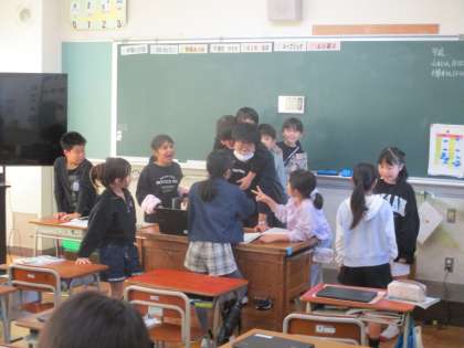 1組は休憩に入り、たくさんの児童が担任教諭の周りに集まっていました。