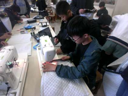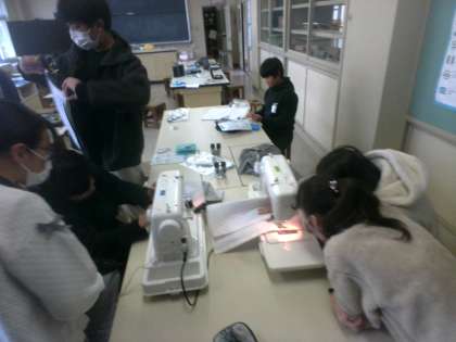 家庭科の時間には、ミシンを使ってトートバッグを作成しています。友達と確認しあいながら、丁寧に作成しています。完成までもう少し!