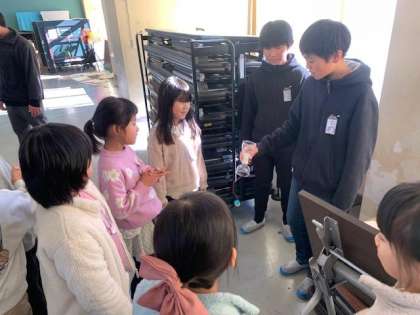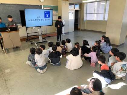 総合的な学習の時間の、海洋ゴミチームの子供たちが、1年生の子供たちとミニ集会を行いました。海洋ゴミの現状やプラスチックのリメイク方法についてスライドで伝えた後、実際にペットボトルけん玉で遊びました。1年生の子供たちに優しく教える姿が見られました。
