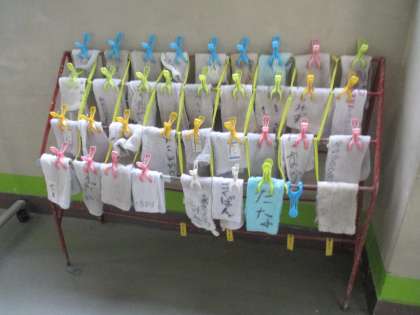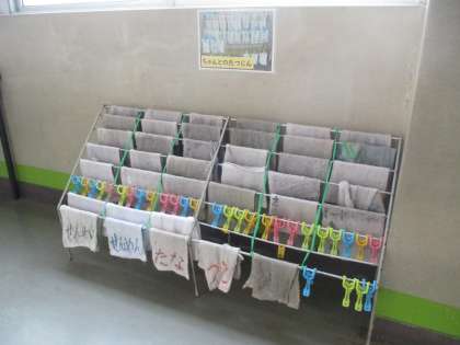 ○一人一人の雑巾が整然と掛けられている様。