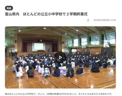 終業式の様子が報道されました 公開日 2024/12/24 更新日 2024/12/24 行事より 終業式の様子が地元放送局から取材を受け、お昼のニュースで放映されましたので紹介します。 画像は「KNB Web」より