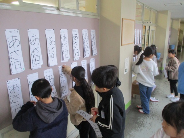 これまで練習してきた作品の一番上に貼り出します。これまでの練習の成果を確かめている姿がとても印象的でした。