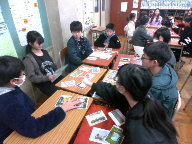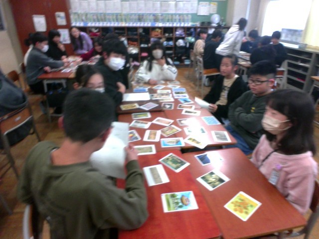 図画工作科の時間には、アートカードを使って、3ヒントクイズかるたをしました。「色、形、イメージ」の3つの観点から、アート作品について感じたことを3ヒントとしました。みんなで、楽しみながら活動しました。