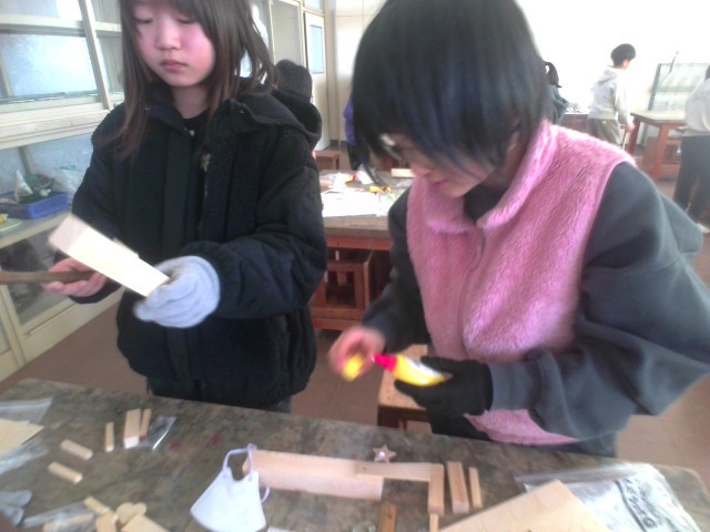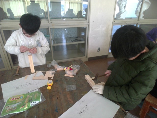 3年生は図工で「くぎうちとんとん」の学習に取り組んでいます。表現したいもの(動物や乗り物など)を決め、木材に釘を打ち込み、形づくっています。はじめはおそるおそる釘を打っていた子供達もだんだんと慣れてきており、釘打ちを楽しむ姿が見られました。