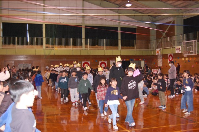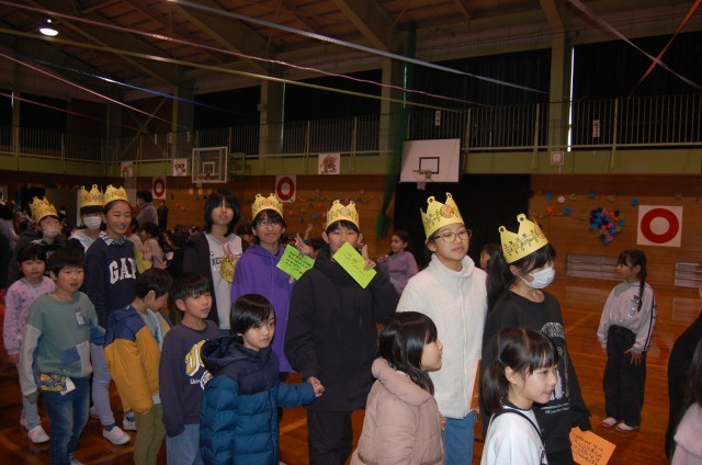 今日は、卒業を祝う会を開きました。1年生がプレゼントしてくれた王冠をかぶって入場しました。中には、このままかぶって下校した子供もいたようです。それだけうれしかったのですね!