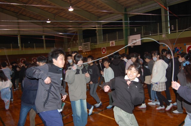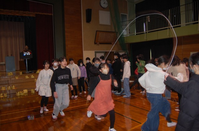4年生は6年生に長縄の回数をどちらが跳べるかを挑みました。