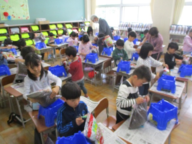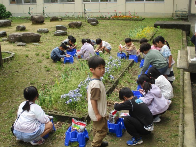 生活科の学習の様子です。アサガオの鉢に種を植えました。